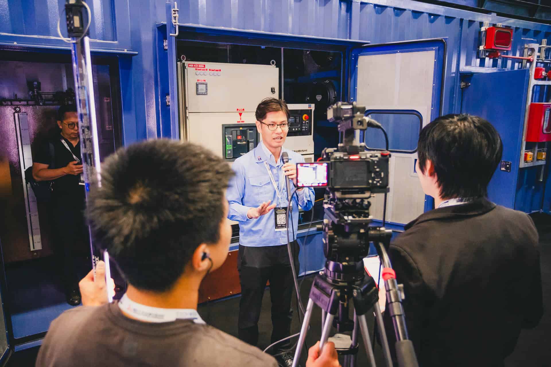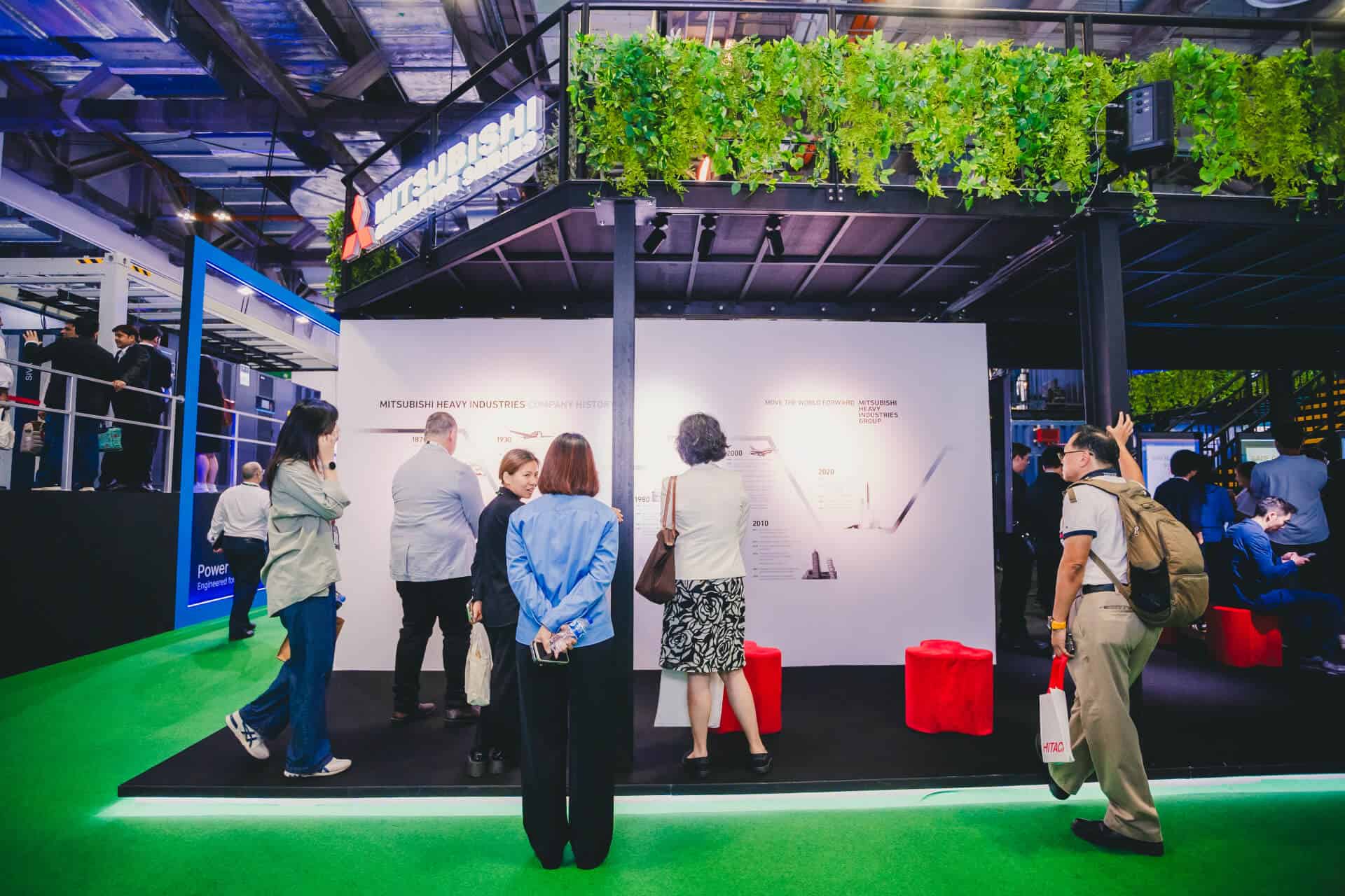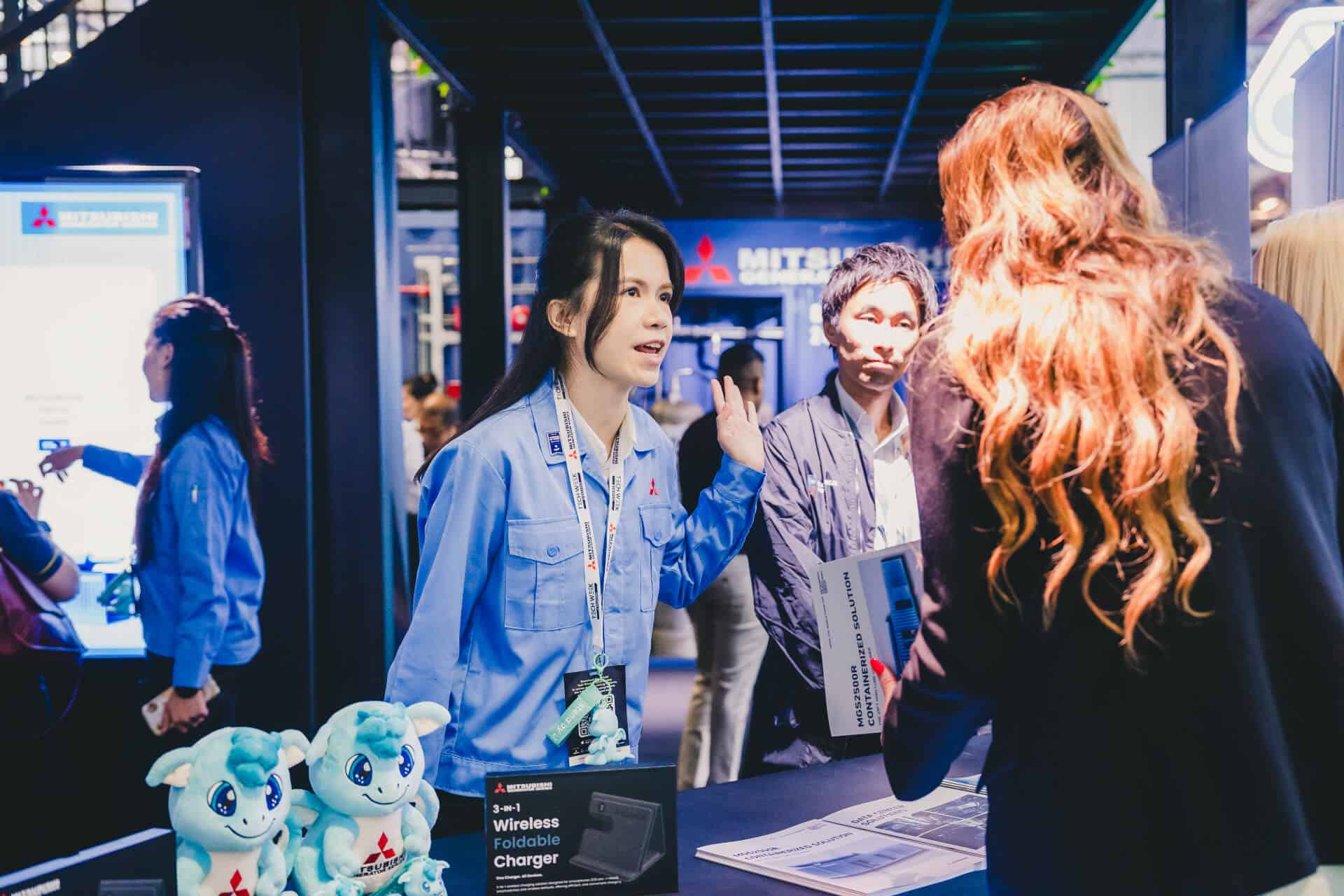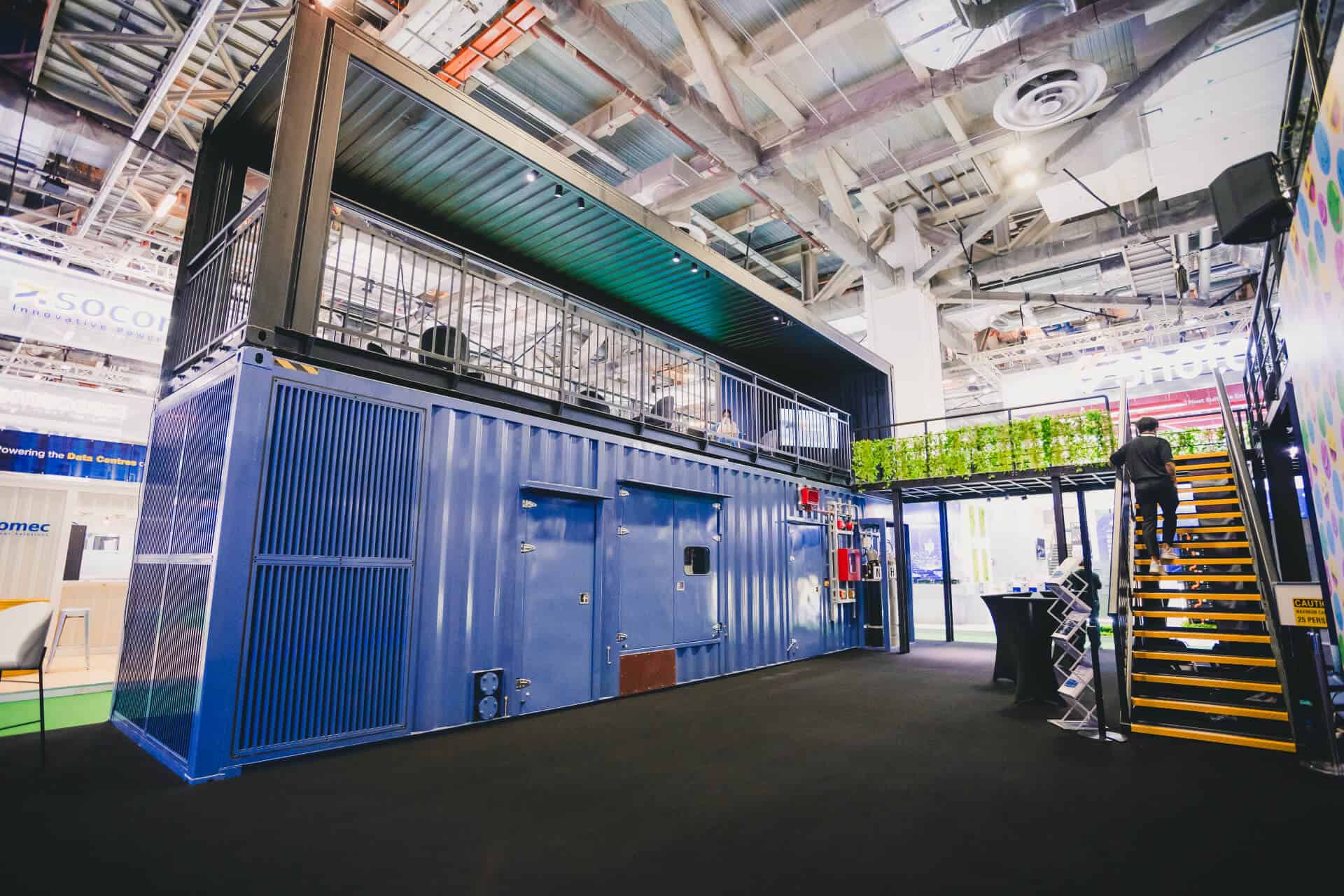 The Mitsubishi Heavy Industries two-storey innovation booth featuring the MGS2500R containerized generator at Data Centre World Asia.